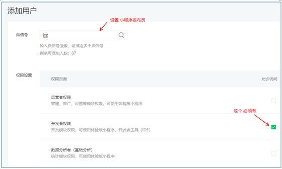2)將我方小程序支持人員,設(shè)置為小程序開發(fā)者,并提供企業(yè)微信的參數(shù)