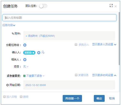 當(dāng)團(tuán)隊(duì)任務(wù)的開關(guān)打開后,我們在分配任務(wù)的時(shí)候就可以選多人,點(diǎn)確定后就可以創(chuàng)建一個(gè)團(tuán)隊(duì)任務(wù)。