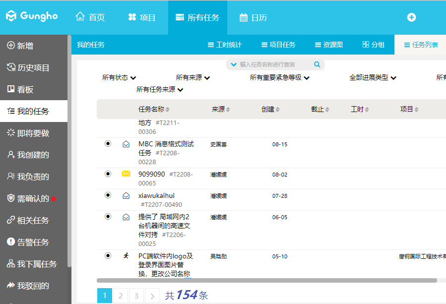 我的任務和任務看板列出的都是我執行的任務,只是在我的任務里列出的任務更全面包括已經完成、歸檔的任務,而看板中列出的都是帶完成的任務。另外,在我的任務頁面中列出的任務的形式和看板不同,看板關注的任務是任務的計劃性,而我的任務頁面更多地體現如何查找、列出任務,任務的分類列表方法更豐富。