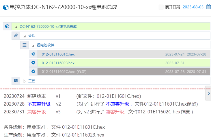 Mobox關于對數據版本的討論 2023/08/03 分類:產品中心 低代碼 實施方案 913 Mobox數據對象,是可以進行版本管控的,關于版本設置 兼容升級: 這個電控軟件 原先的版本被廢棄,直接采用當前新的版本 不兼容升級:這個新版本,只能在當前生產的電控總成里面用,以前的老的電控總成 是不能安裝到這個新電控軟件的;? 以前的電控總成將成為 備件燒制; 效果圖: 我們可以看到 v1 他是有時效性的,有效期到 20230728 標簽:低代碼方案 上一篇: Mobox低代碼(WMS)關于入庫作業流程的思考 下一篇: mogodb數據庫端口外網偵測不到