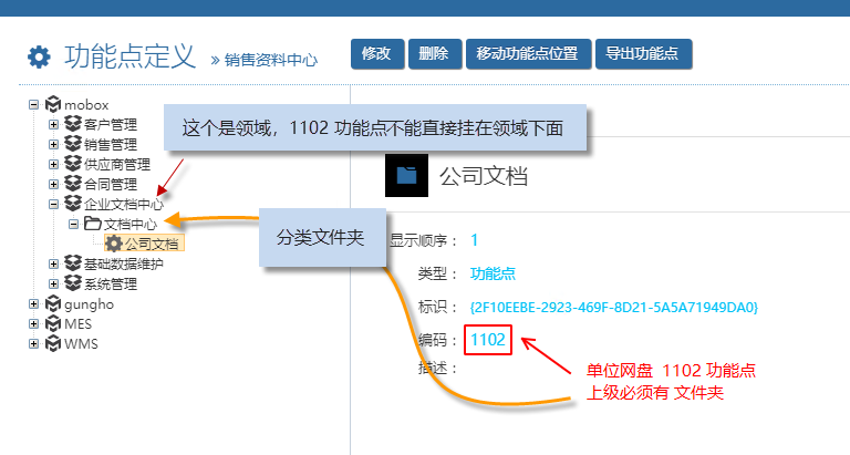 Mobox文檔中心定義 – 1101 及 1102 功能點 注意 2023/09/13 分類:產品中心 實施方案 837 mobox文檔中心可以掛接 1、單位網盤? ? ? ?(1102 功能點) 2、部門網盤? ? ? ?(1102 功能點) 在設置的Mobox文檔中心的時候,功能點不能直接掛到領域下面,而必須在領域下面先建立分類文件夾,之后才能掛接這2個功能點。 若直接掛到領域下面,會出現 而需要改成下圖發設置方法 標簽:方案 上一篇: 低代碼平臺關于數據對象定版后權限控制 下一篇: 關于Gungho及Mobox的授權(臨時授權部分)