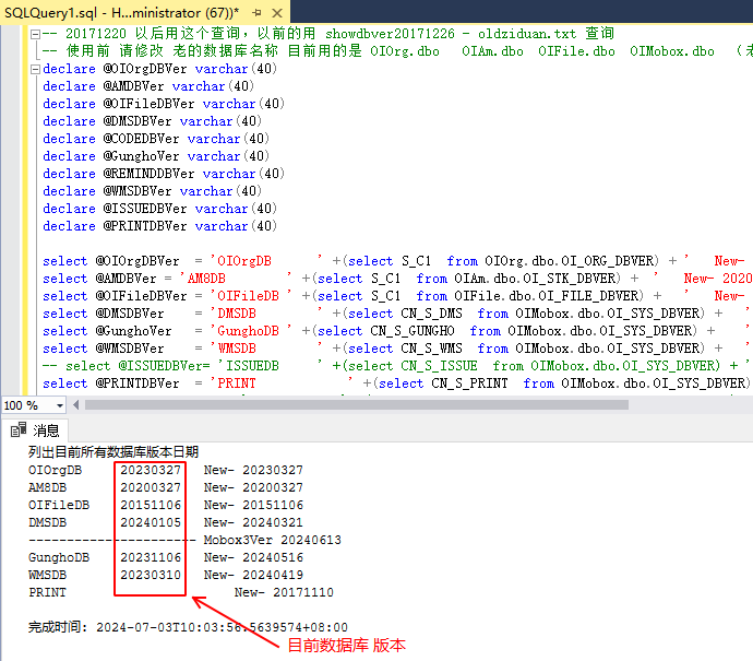 select @DMSDBVer = ‘DMSDB ‘ +(select CN_S_DMS from OIMobox.dbo.OI_SYS_DBVER) + ‘ New- 20240321’
